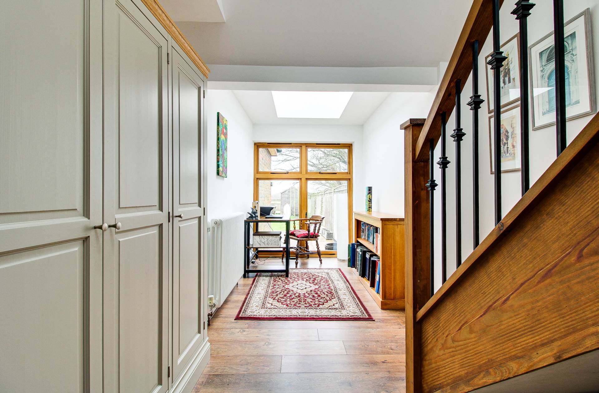 18'10 x 8'9. Oak frame double glazed window to garden and vaulted lantern ceiling. Stairs to first floor lobby. Modern radiator.